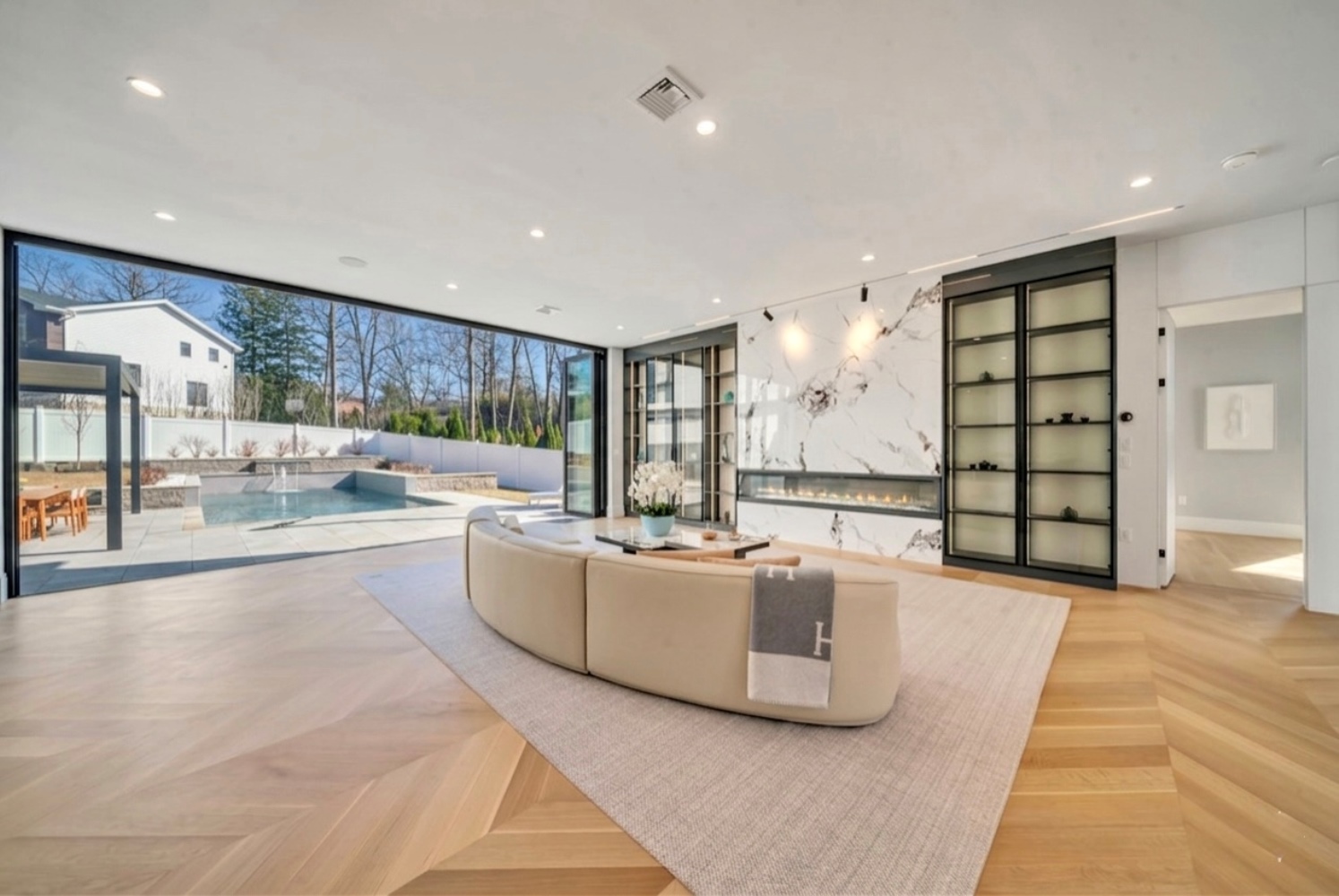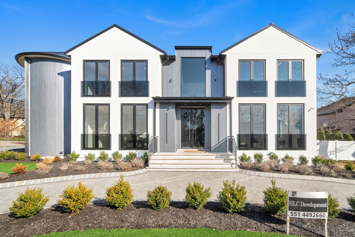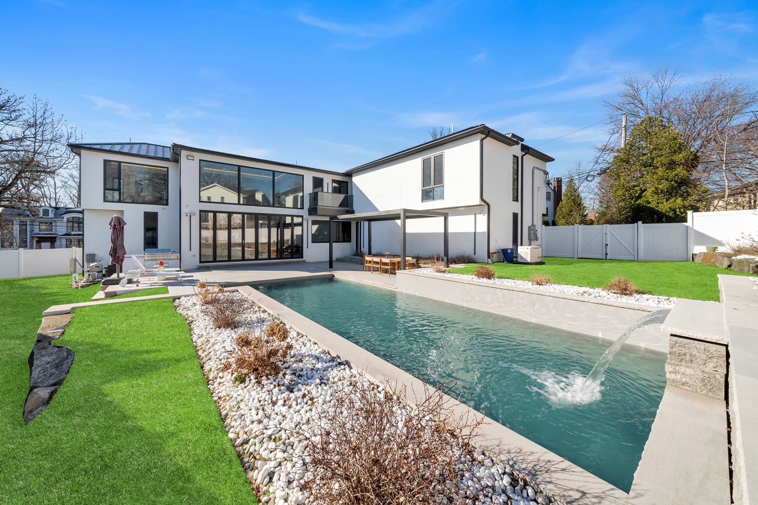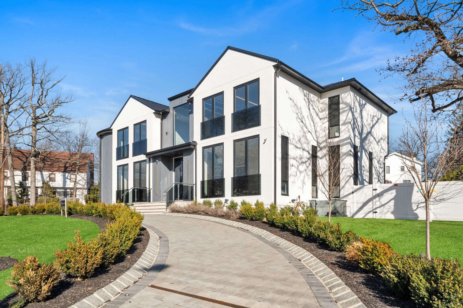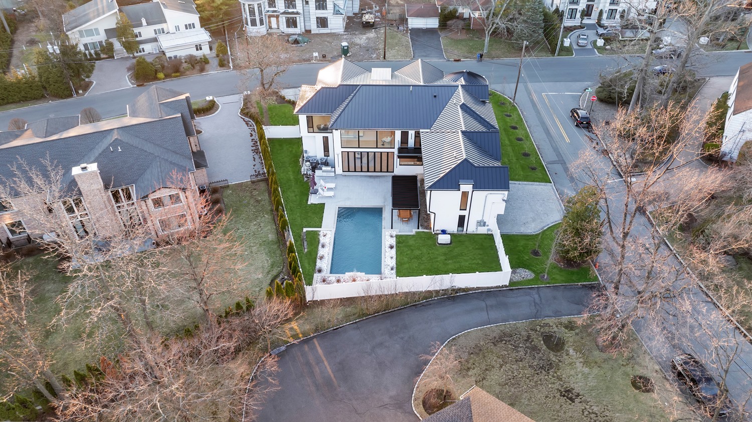 Located on Roberts Road, one of Englewood Cliffs’ premier streets, this new construction, metal roof 7-bedroom, 8.1 bath residence sits on 0.47 acres and offers approximately 11,500 square feet across 3 elevator-serviced levels. The main level features an open living space w/ fireplace and a full-width folding glass wall system that fully opens to the patio and pool. The kitchen is finished with custom high-gloss cabinetry, full slab stone with bookmatched detailing, a Sub-Zero and Wolf appliance suite, walk-in pantry, mudroom, office, 1st-floor bedroom suite, powder room, laundry w/ sink and built-ins, and a full bath serving the pool. Upstairs, the primary suite offers a sitting area, fireplace, beverage bar, balcony access, custom closets, bath w/ soaking tub, glass-enclosed shower, and towel warmer. A junior suite includes its own sitting area, beverage bar, and dual double-door openings for ventilation. Three additional bedrooms are all en-suite with custom closets. The fully finished lower level includes a theater with fully reclining massage seating, bar, recreation space, ~550 bottle wine room, additional bedroom, and full bath. Outdoor features include a heated gunite pool with waterfall, custom Walpole grilling station, pergola with adjustable roof, and anti-slip stone patio. A 3 car heated garage with EV provision, whole-house generator, metal roof, smart home system + irrigation, Sonos, and multi-zone heating & cooling with radiant heat complete the home.