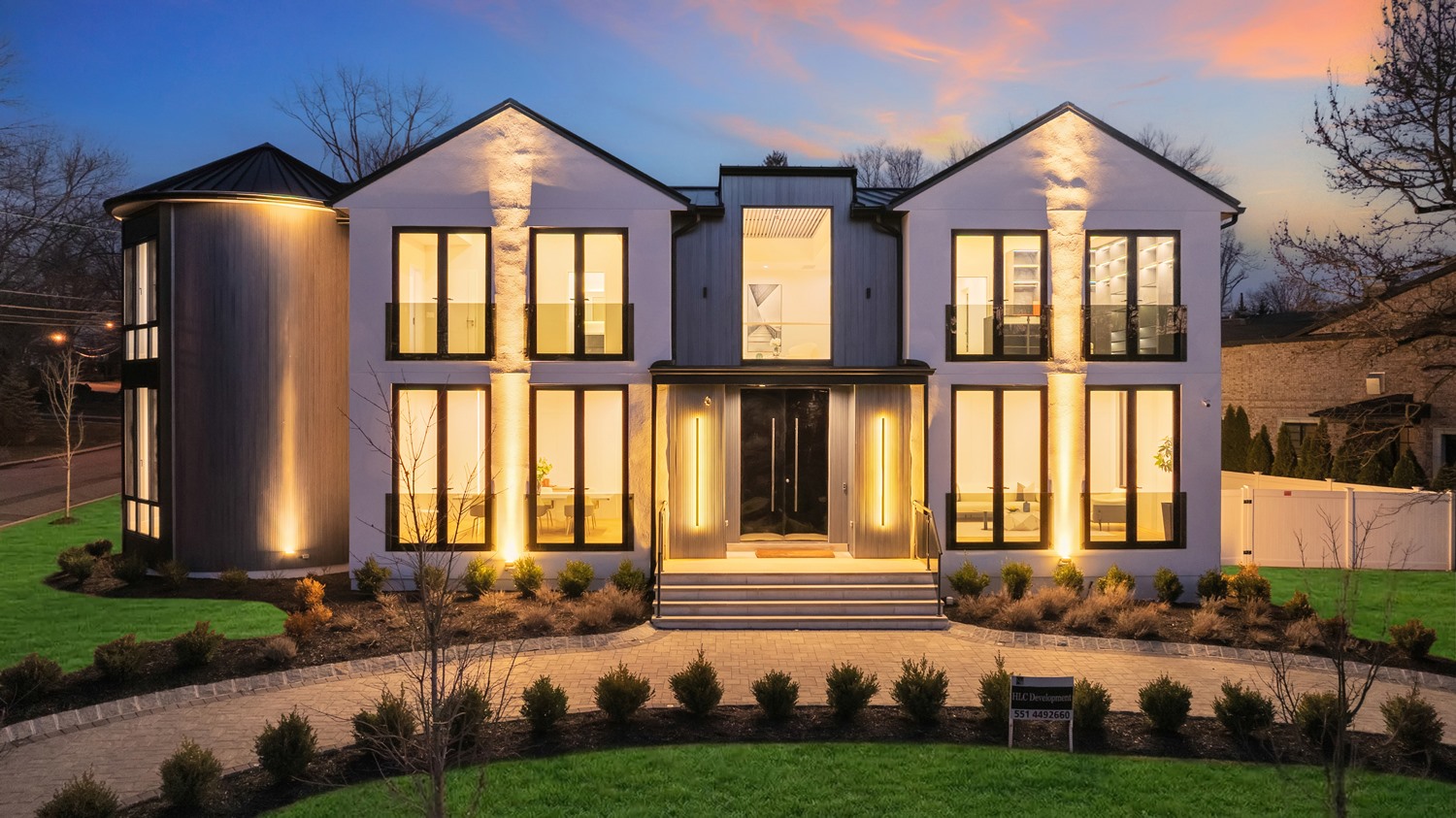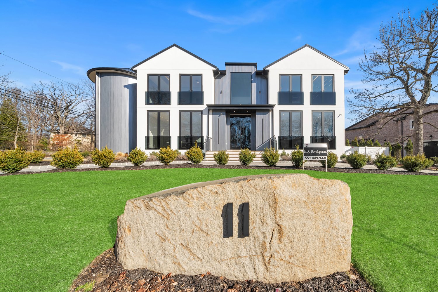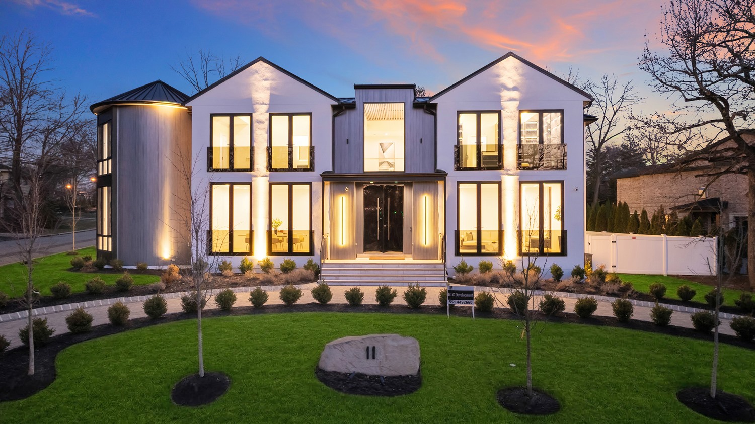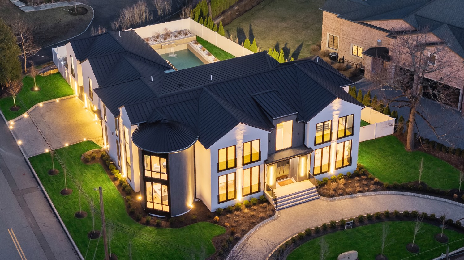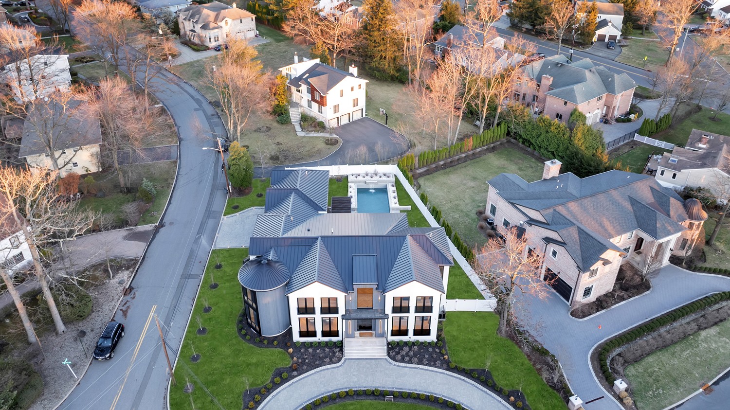 Located on Roberts Road, one of Englewood Cliffs’ premier streets, this new construction, metal roof 7-bedroom, 8.1 bath residence sits on 0.47 acres and offers approximately 11,500 square feet across 3 elevator-serviced levels. The main level features an open living space w/ fireplace and a full-width folding glass wall system that fully opens to the patio and pool. The kitchen is finished with custom high-gloss cabinetry, full slab stone with bookmatched detailing, a Sub-Zero and Wolf appliance suite, walk-in pantry, mudroom, office, 1st-floor bedroom suite, powder room, laundry w/ sink and built-ins, and a full bath serving the pool. Upstairs, the primary suite offers a sitting area, fireplace, beverage bar, balcony access, custom closets, bath w/ soaking tub, glass-enclosed shower, and towel warmer. A junior suite includes its own sitting area, beverage bar, and dual double-door openings for ventilation. Three additional bedrooms are all en-suite with custom closets. The fully finished lower level includes a theater with fully reclining massage seating, bar, recreation space, ~550 bottle wine room, additional bedroom, and full bath. Outdoor features include a heated gunite pool with waterfall, custom Walpole grilling station, pergola with adjustable roof, and anti-slip stone patio. A 3 car heated garage with EV provision, whole-house generator, metal roof, smart home system + irrigation, Sonos, and multi-zone heating & cooling with radiant heat complete the home.
