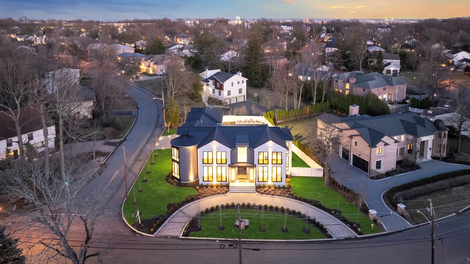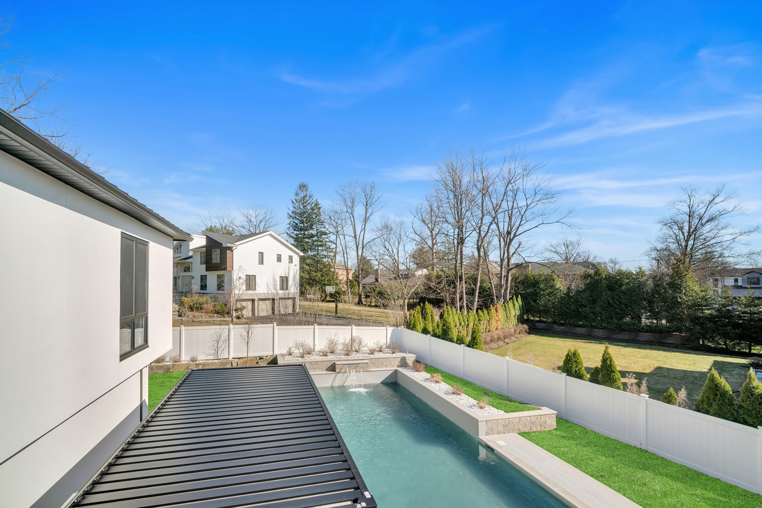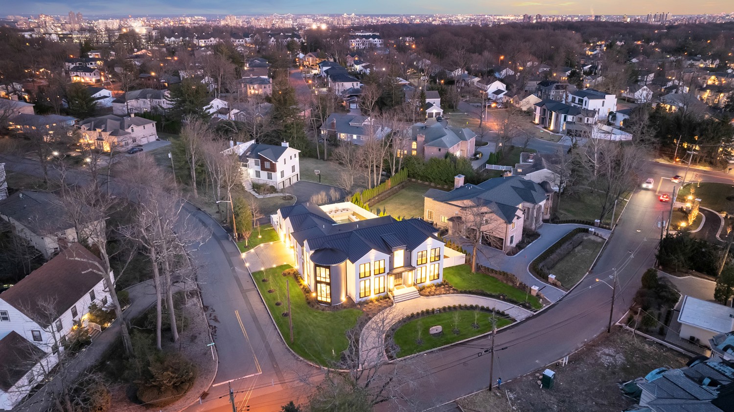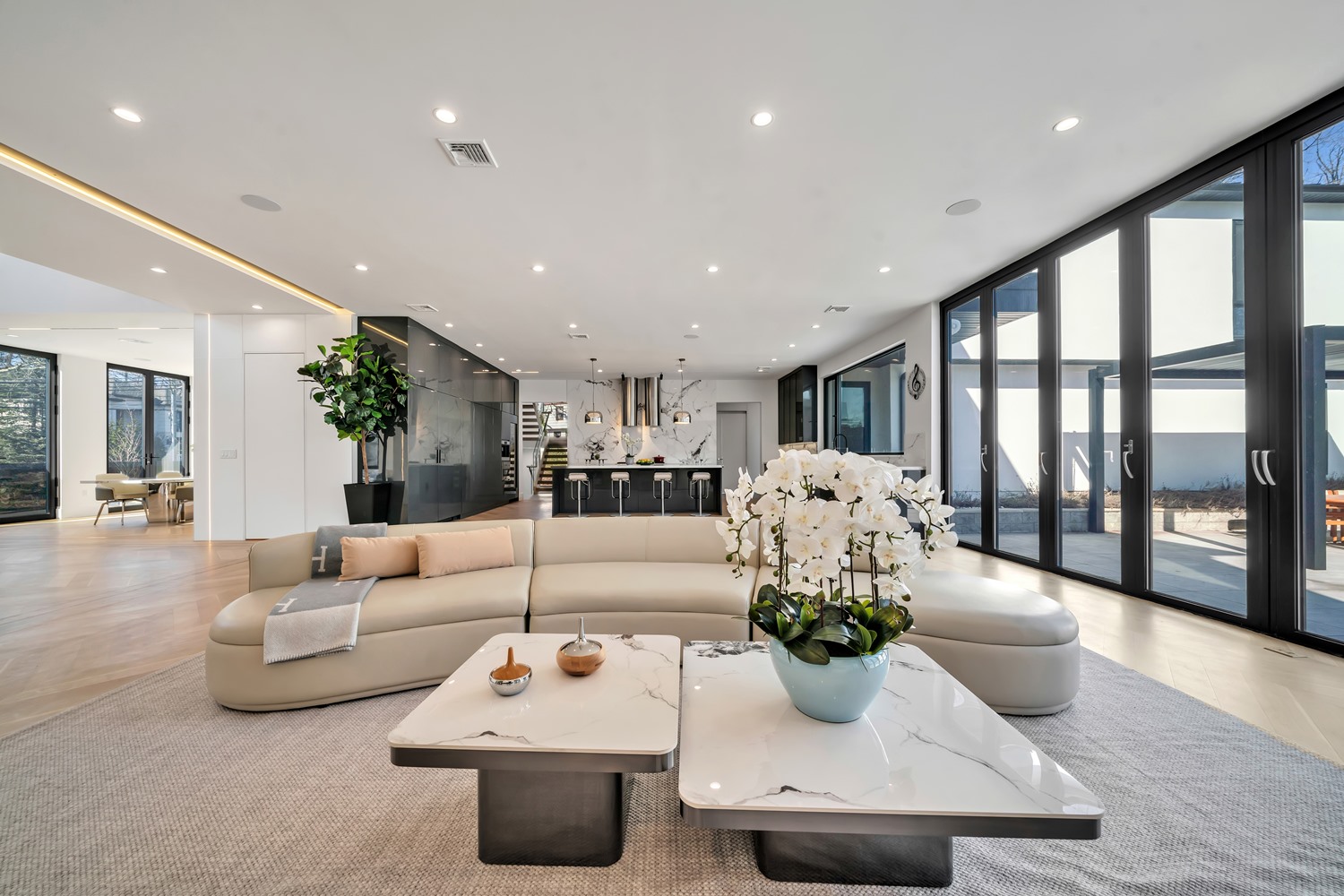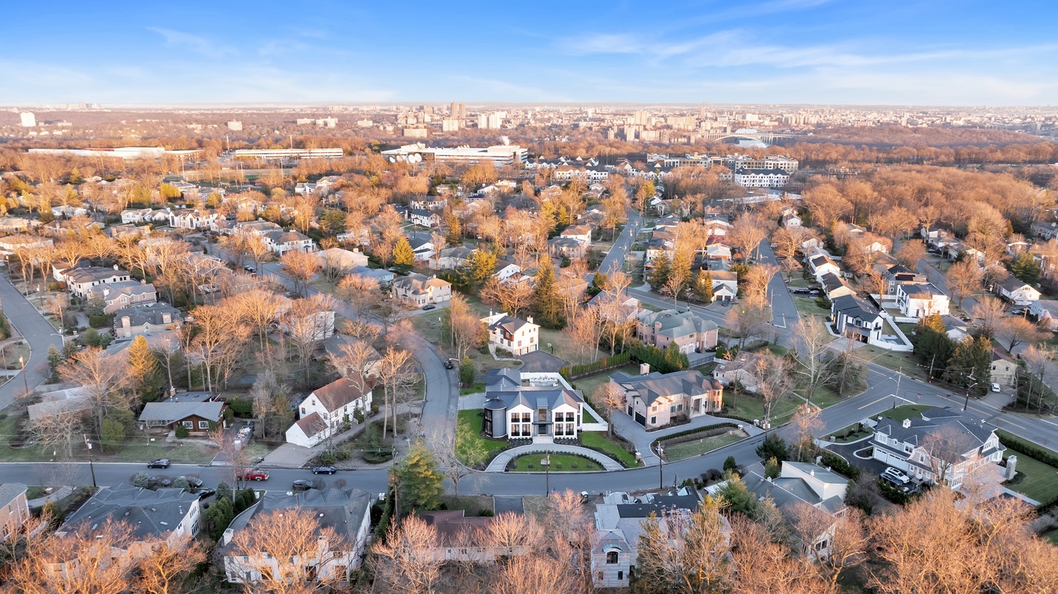 Located on Roberts Road, one of Englewood Cliffs’ premier streets, this new construction, metal roof 7-bedroom, 8.1 bath residence sits on 0.47 acres and offers approximately 11,500 square feet across 3 elevator-serviced levels. The main level features an open living space w/ fireplace and a full-width folding glass wall system that fully opens to the patio and pool. The kitchen is finished with custom high-gloss cabinetry, full slab stone with bookmatched detailing, a Sub-Zero and Wolf appliance suite, walk-in pantry, mudroom, office, 1st-floor bedroom suite, powder room, laundry w/ sink and built-ins, and a full bath serving the pool. Upstairs, the primary suite offers a sitting area, fireplace, beverage bar, balcony access, custom closets, bath w/ soaking tub, glass-enclosed shower, and towel warmer. A junior suite includes its own sitting area, beverage bar, and dual double-door openings for ventilation. Three additional bedrooms are all en-suite with custom closets. The fully finished lower level includes a theater with fully reclining massage seating, bar, recreation space, ~550 bottle wine room, additional bedroom, and full bath. Outdoor features include a heated gunite pool with waterfall, custom Walpole grilling station, pergola with adjustable roof, and anti-slip stone patio. A 3 car heated garage with EV provision, whole-house generator, metal roof, smart home system + irrigation, Sonos, and multi-zone heating & cooling with radiant heat complete the home.