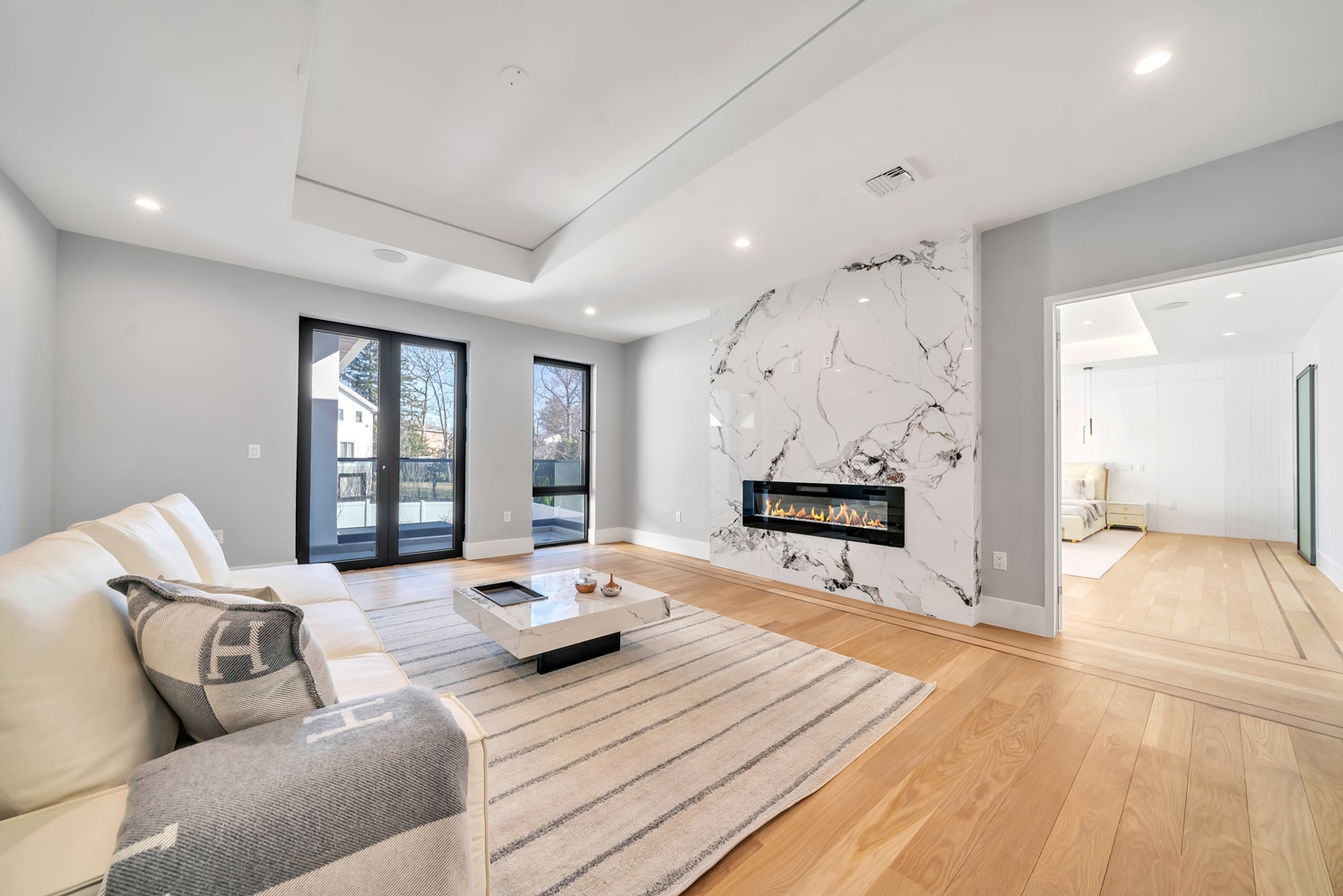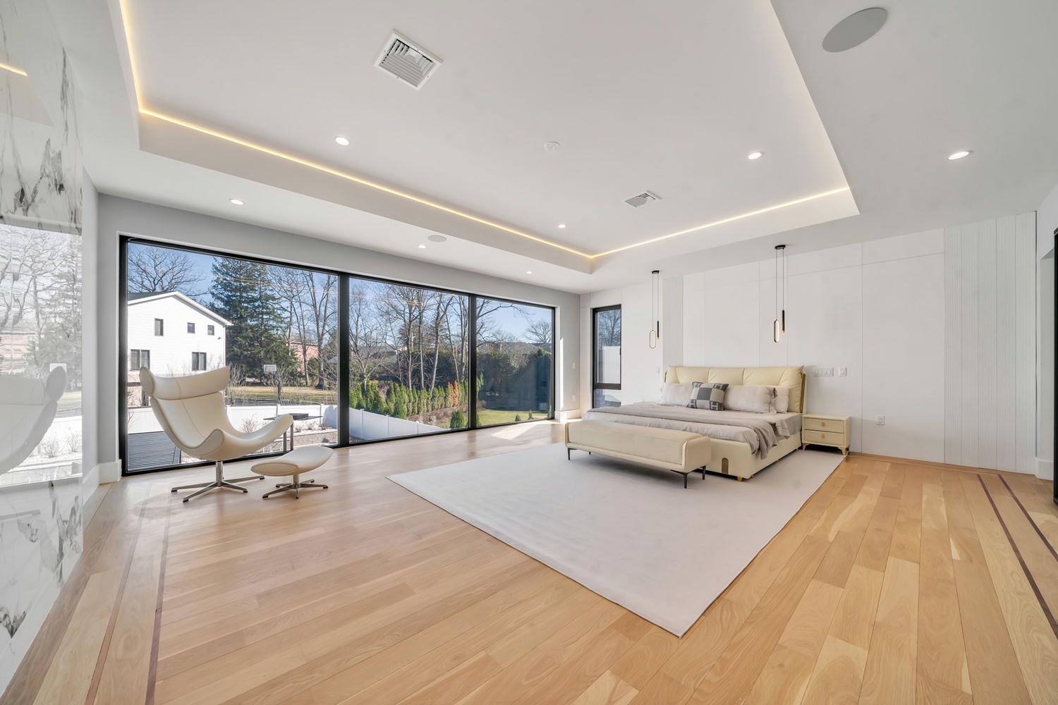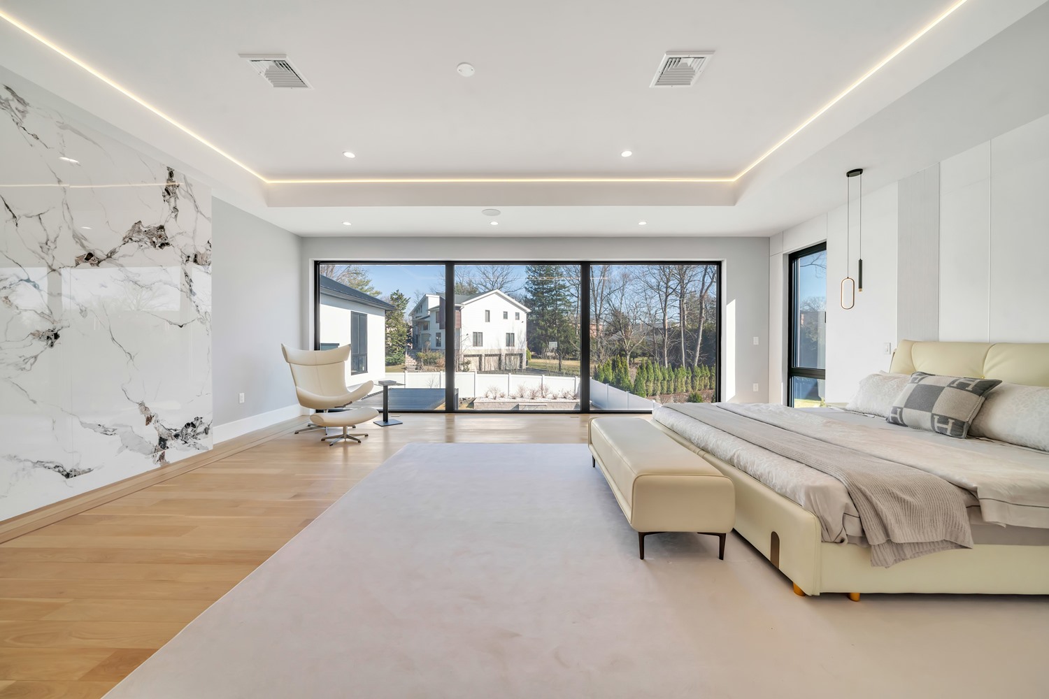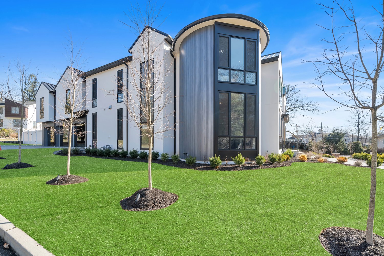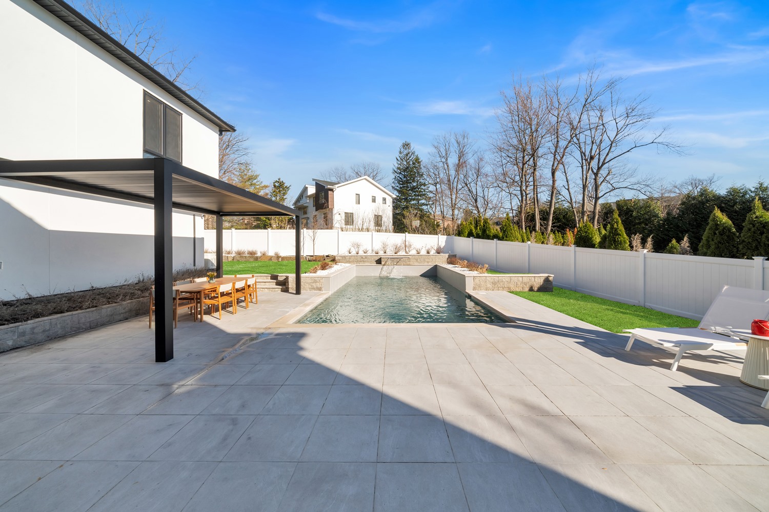 Located on Roberts Road, one of Englewood Cliffs’ premier streets, this new construction, metal roof 7-bedroom, 8.1 bath residence sits on 0.47 acres and offers approximately 11,500 square feet across 3 elevator-serviced levels. The main level features an open living space w/ fireplace and a full-width folding glass wall system that fully opens to the patio and pool. The kitchen is finished with custom high-gloss cabinetry, full slab stone with bookmatched detailing, a Sub-Zero and Wolf appliance suite, walk-in pantry, mudroom, office, 1st-floor bedroom suite, powder room, laundry w/ sink and built-ins, and a full bath serving the pool. Upstairs, the primary suite offers a sitting area, fireplace, beverage bar, balcony access, custom closets, bath w/ soaking tub, glass-enclosed shower, and towel warmer. A junior suite includes its own sitting area, beverage bar, and dual double-door openings for ventilation. Three additional bedrooms are all en-suite with custom closets. The fully finished lower level includes a theater with fully reclining massage seating, bar, recreation space, ~550 bottle wine room, additional bedroom, and full bath. Outdoor features include a heated gunite pool with waterfall, custom Walpole grilling station, pergola with adjustable roof, and anti-slip stone patio. A 3 car heated garage with EV provision, whole-house generator, metal roof, smart home system + irrigation, Sonos, and multi-zone heating & cooling with radiant heat complete the home.
