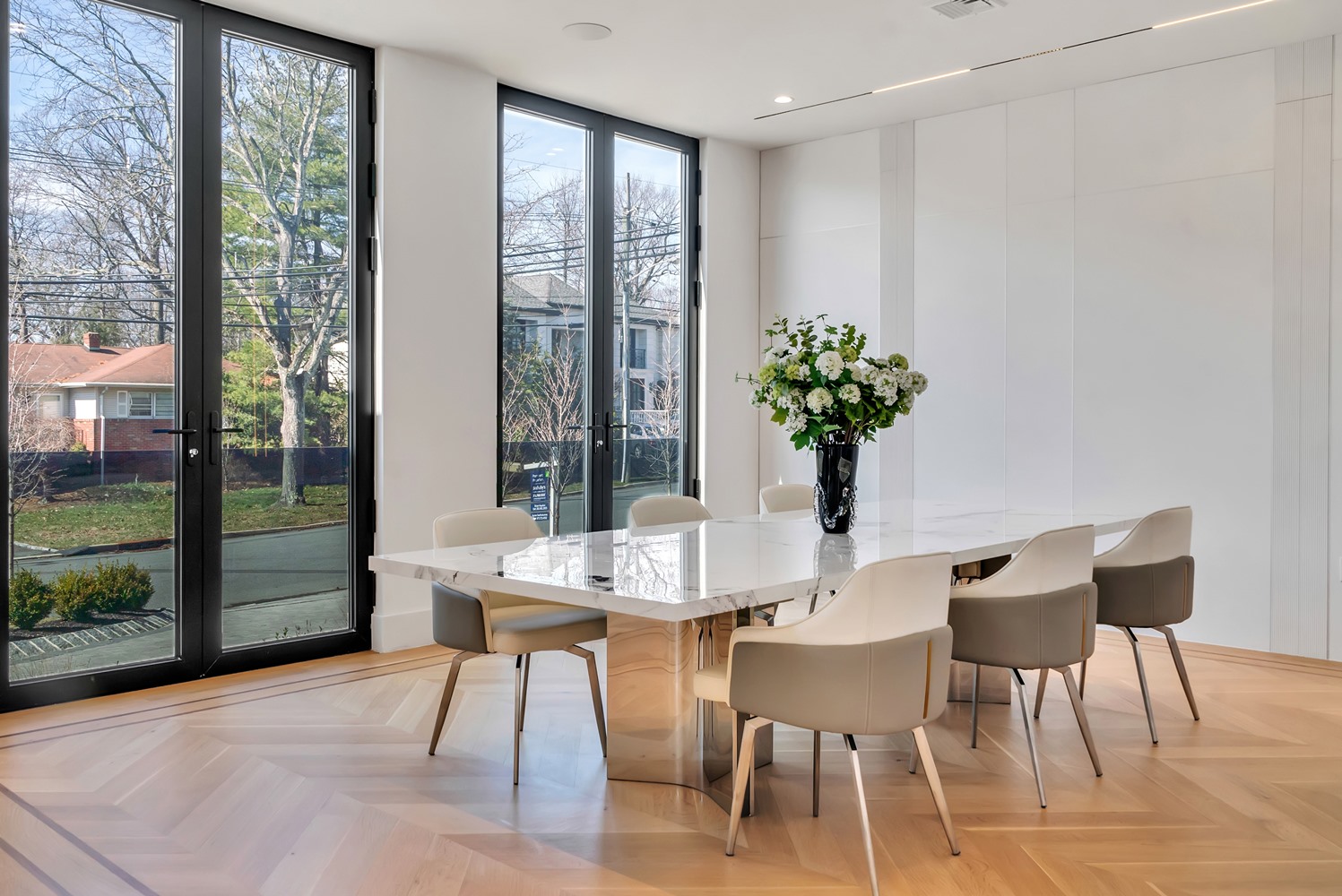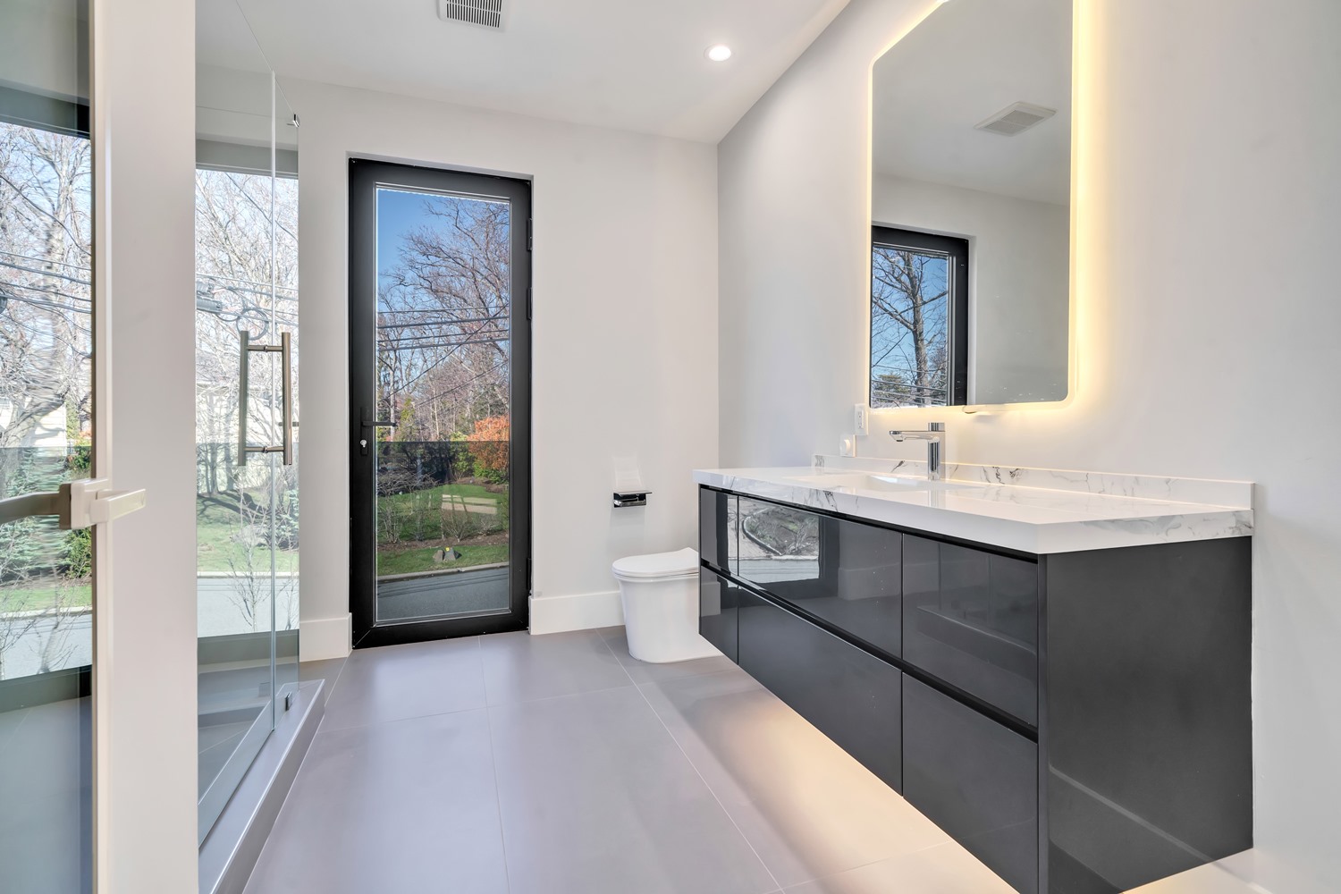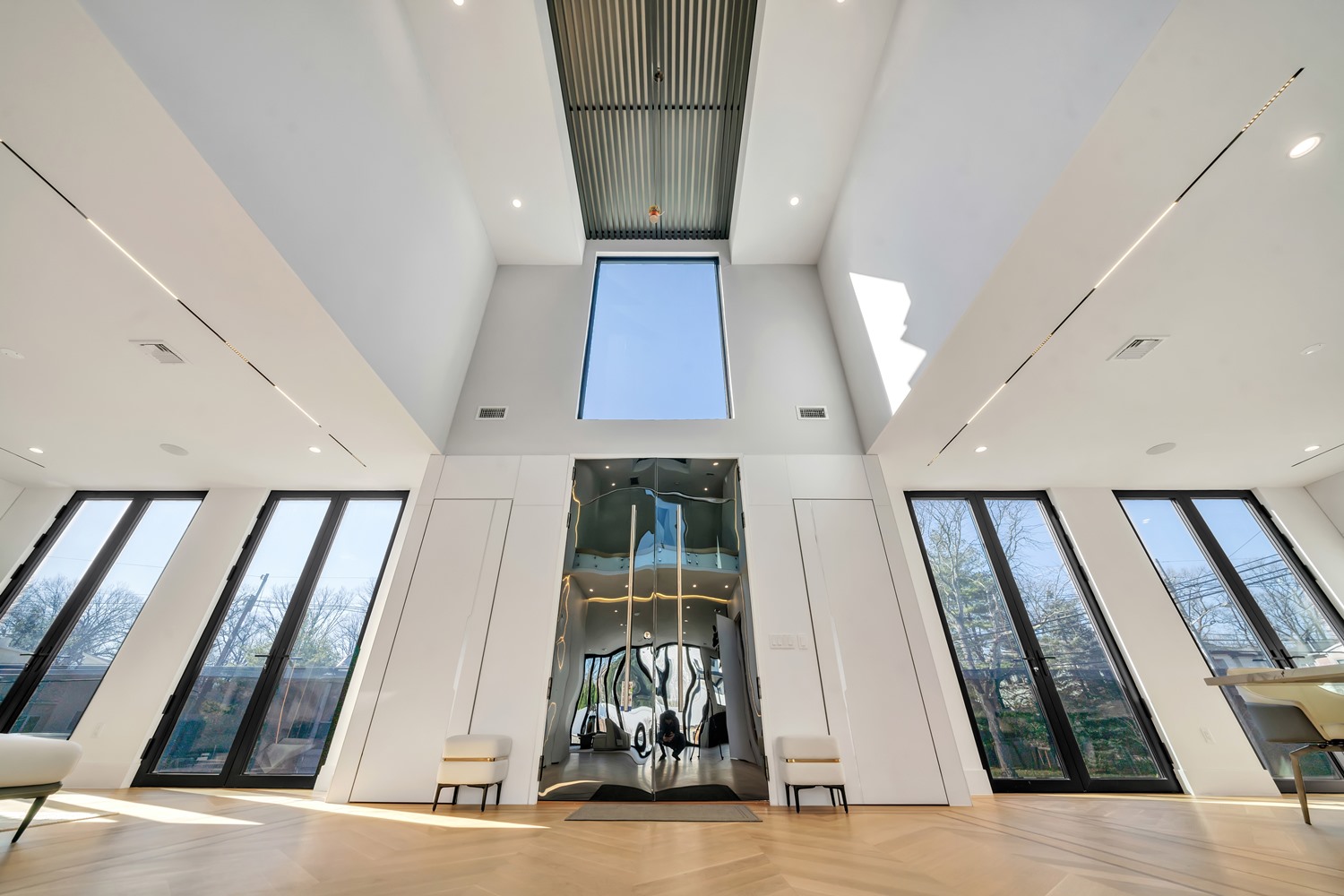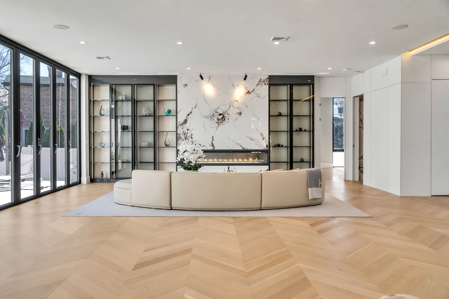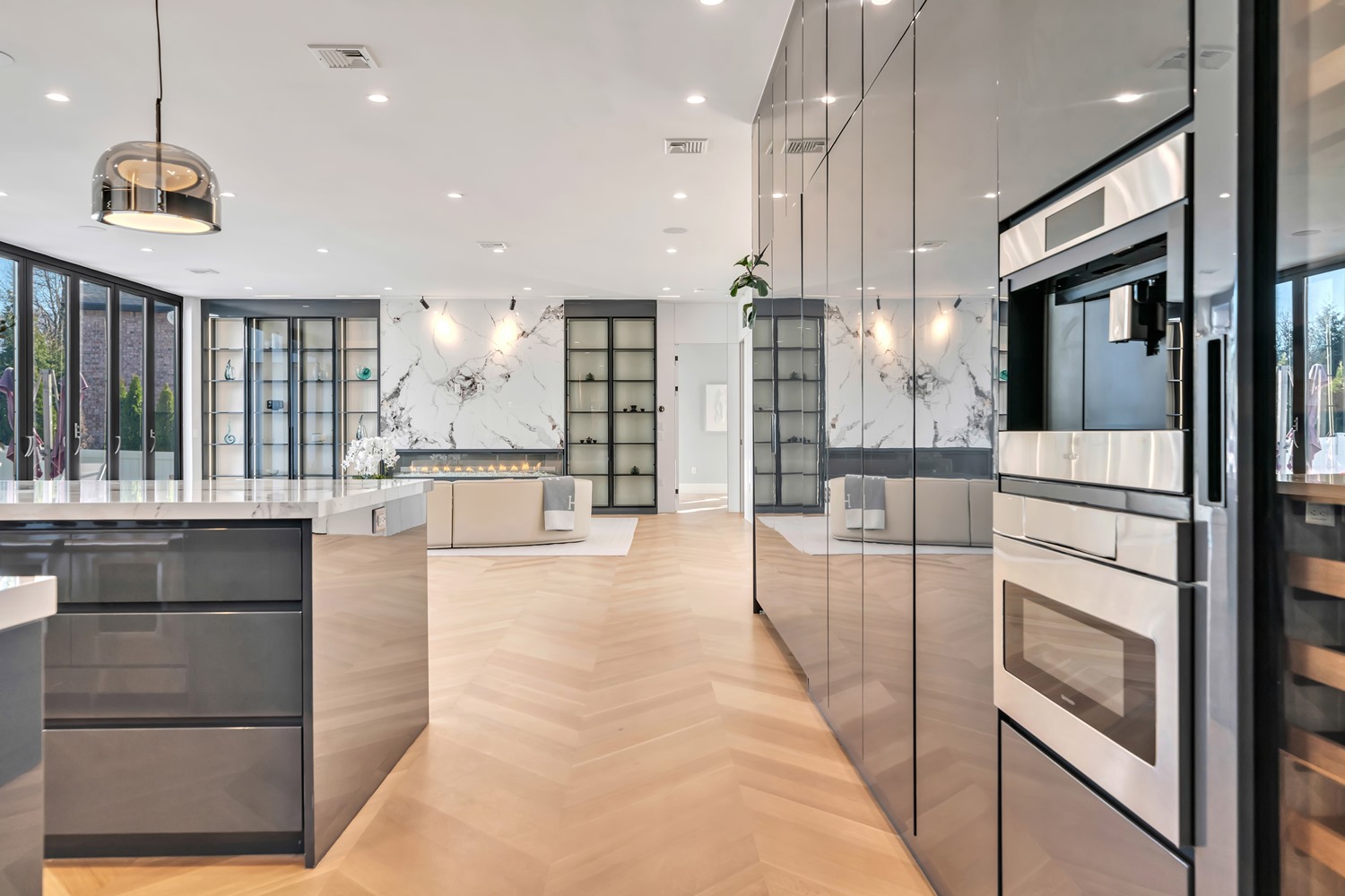 Located on Roberts Road, one of Englewood Cliffs’ premier streets, this new construction, metal roof 7-bedroom, 8.1 bath residence sits on 0.47 acres and offers approximately 11,500 square feet across 3 elevator-serviced levels. The main level features an open living space w/ fireplace and a full-width folding glass wall system that fully opens to the patio and pool. The kitchen is finished with custom high-gloss cabinetry, full slab stone with bookmatched detailing, a Sub-Zero and Wolf appliance suite, walk-in pantry, mudroom, office, 1st-floor bedroom suite, powder room, laundry w/ sink and built-ins, and a full bath serving the pool. Upstairs, the primary suite offers a sitting area, fireplace, beverage bar, balcony access, custom closets, bath w/ soaking tub, glass-enclosed shower, and towel warmer. A junior suite includes its own sitting area, beverage bar, and dual double-door openings for ventilation. Three additional bedrooms are all en-suite with custom closets. The fully finished lower level includes a theater with fully reclining massage seating, bar, recreation space, ~550 bottle wine room, additional bedroom, and full bath. Outdoor features include a heated gunite pool with waterfall, custom Walpole grilling station, pergola with adjustable roof, and anti-slip stone patio. A 3 car heated garage with EV provision, whole-house generator, metal roof, smart home system + irrigation, Sonos, and multi-zone heating & cooling with radiant heat complete the home.