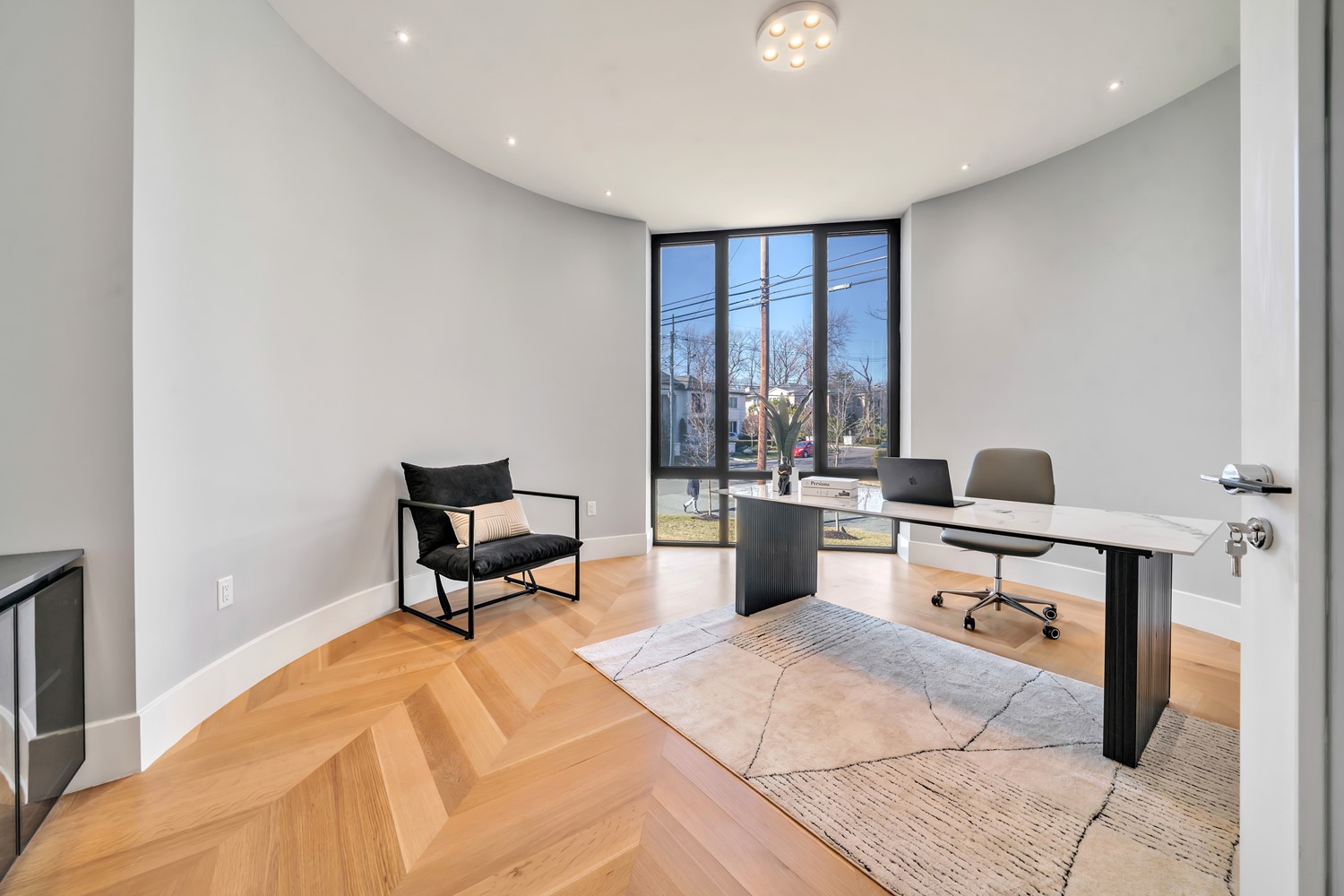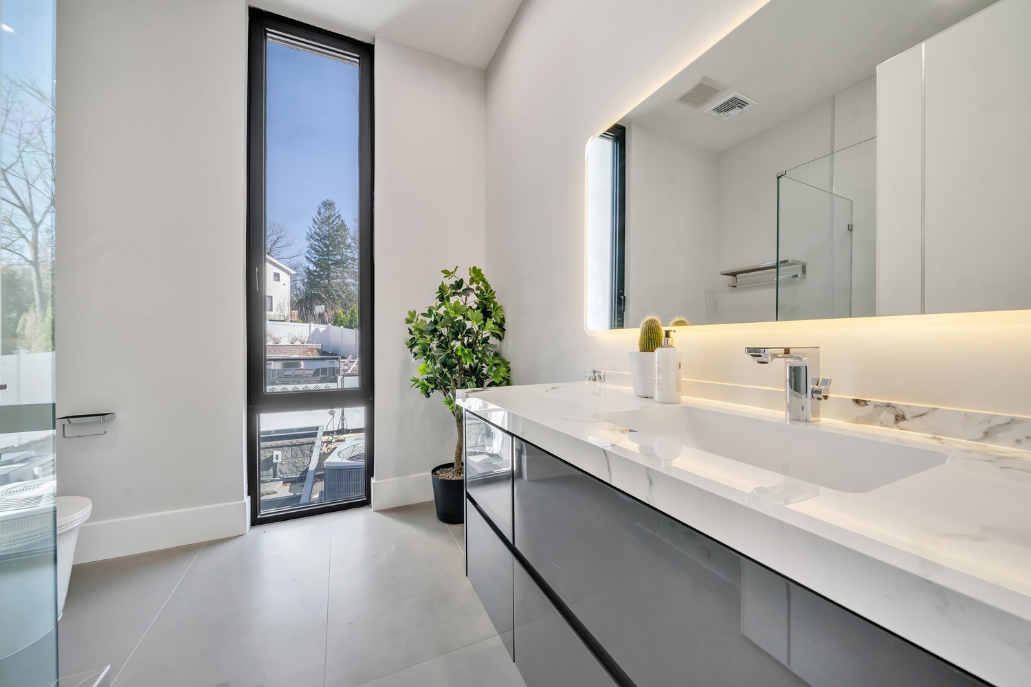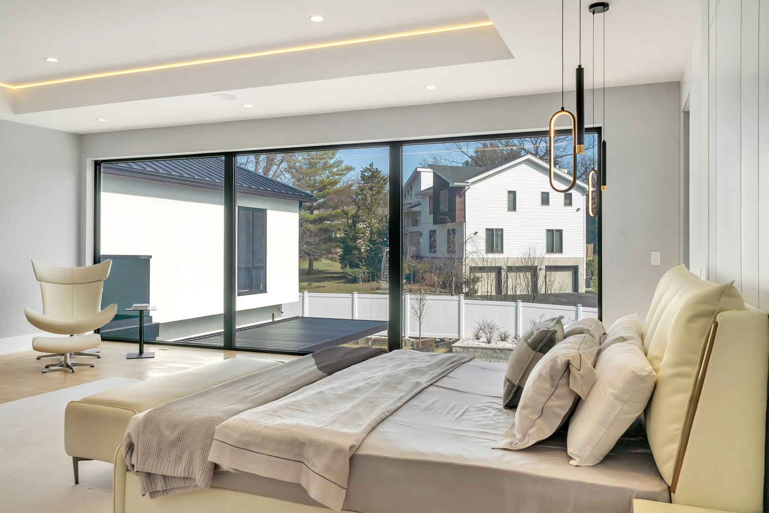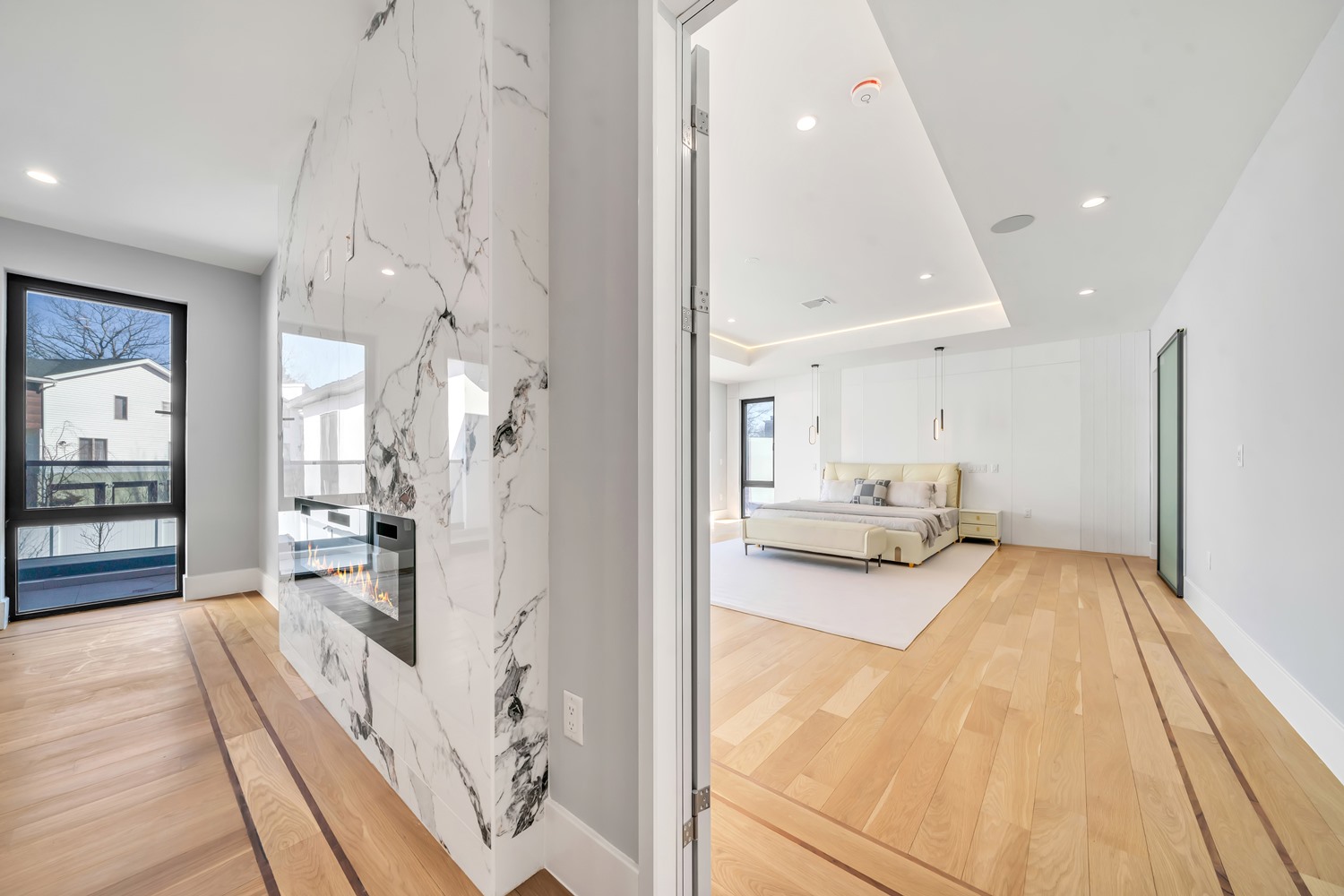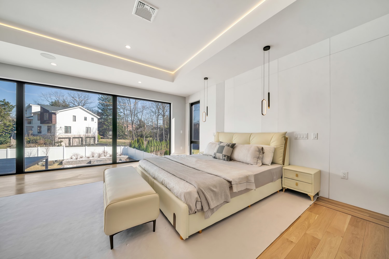 Located on Roberts Road, one of Englewood Cliffs’ premier streets, this new construction, metal roof 7-bedroom, 8.1 bath residence sits on 0.47 acres and offers approximately 11,500 square feet across 3 elevator-serviced levels. The main level features an open living space w/ fireplace and a full-width folding glass wall system that fully opens to the patio and pool. The kitchen is finished with custom high-gloss cabinetry, full slab stone with bookmatched detailing, a Sub-Zero and Wolf appliance suite, walk-in pantry, mudroom, office, 1st-floor bedroom suite, powder room, laundry w/ sink and built-ins, and a full bath serving the pool. Upstairs, the primary suite offers a sitting area, fireplace, beverage bar, balcony access, custom closets, bath w/ soaking tub, glass-enclosed shower, and towel warmer. A junior suite includes its own sitting area, beverage bar, and dual double-door openings for ventilation. Three additional bedrooms are all en-suite with custom closets. The fully finished lower level includes a theater with fully reclining massage seating, bar, recreation space, ~550 bottle wine room, additional bedroom, and full bath. Outdoor features include a heated gunite pool with waterfall, custom Walpole grilling station, pergola with adjustable roof, and anti-slip stone patio. A 3 car heated garage with EV provision, whole-house generator, metal roof, smart home system + irrigation, Sonos, and multi-zone heating & cooling with radiant heat complete the home.