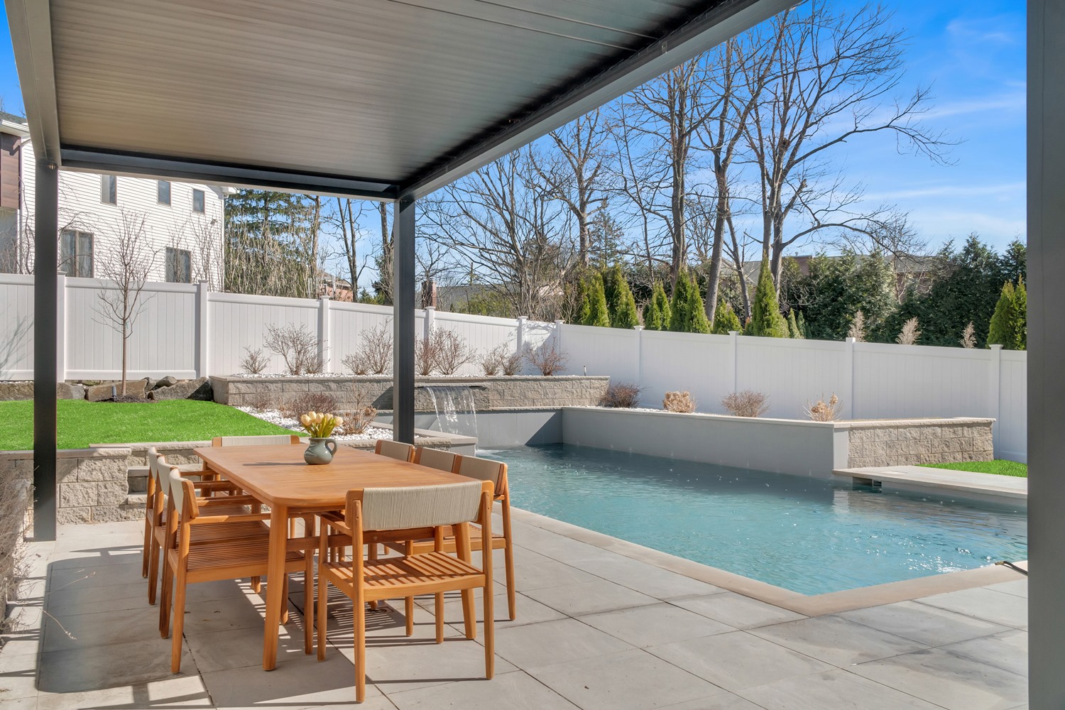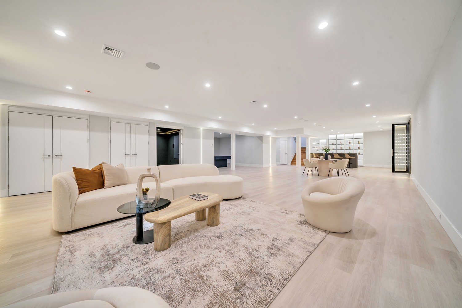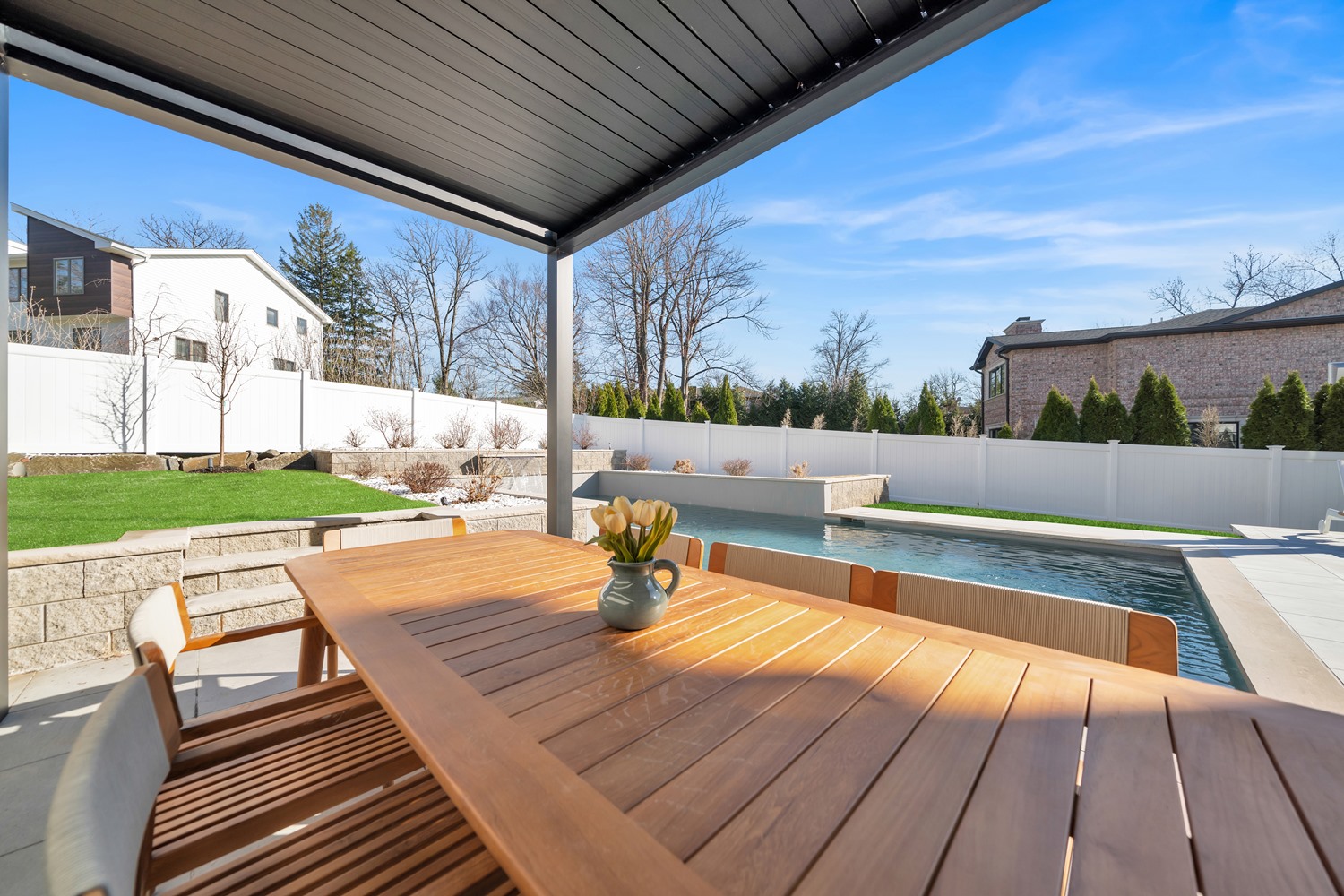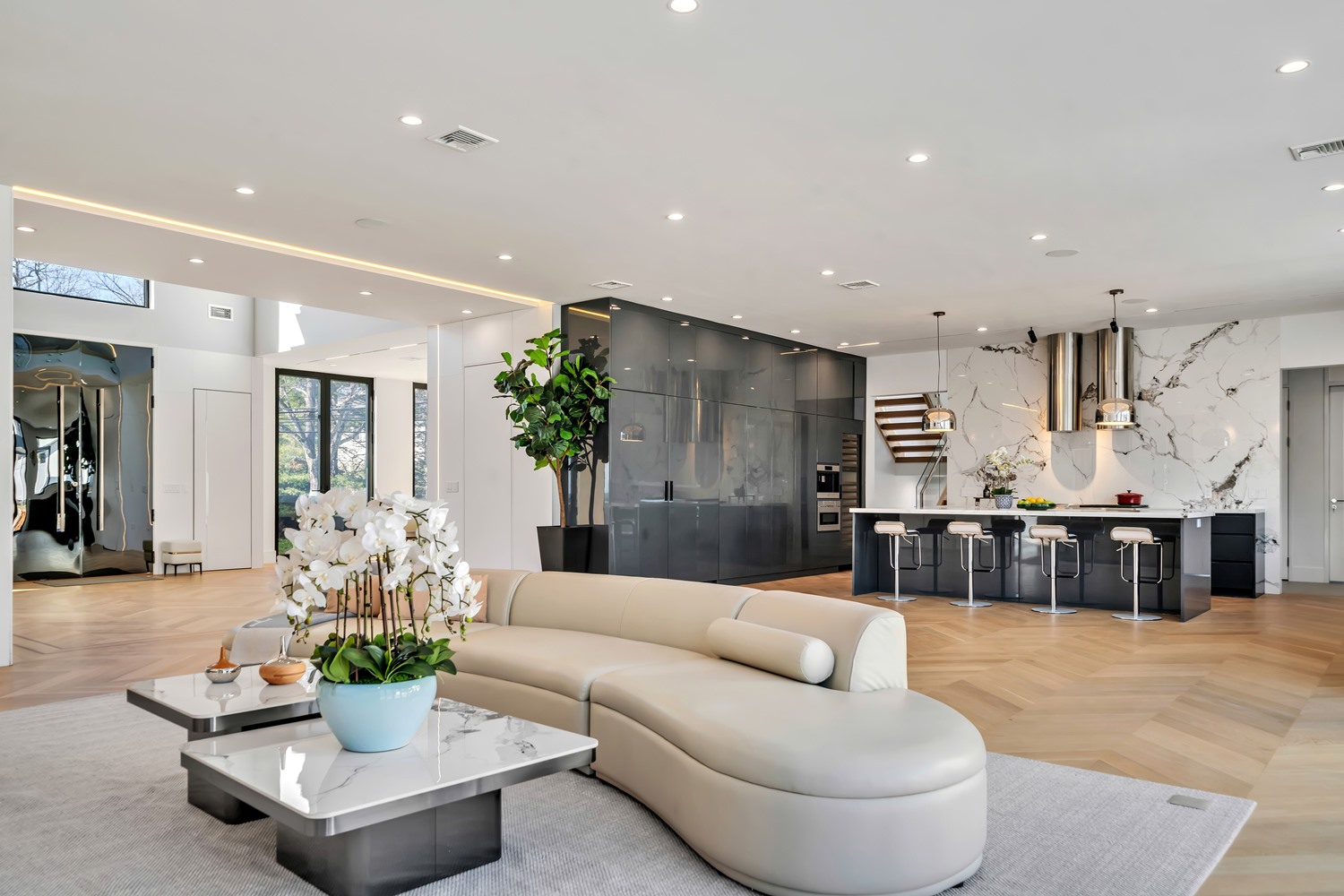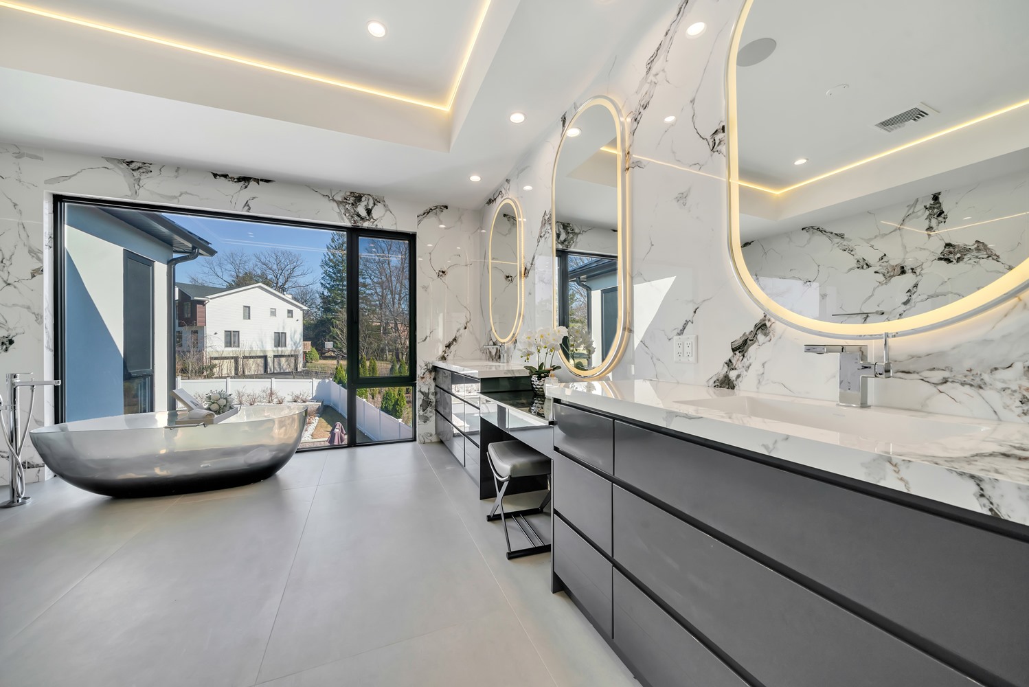 Located on Roberts Road, one of Englewood Cliffs’ premier streets, this new construction, metal roof 7-bedroom, 8.1 bath residence sits on 0.47 acres and offers approximately 11,500 square feet across 3 elevator-serviced levels. The main level features an open living space w/ fireplace and a full-width folding glass wall system that fully opens to the patio and pool. The kitchen is finished with custom high-gloss cabinetry, full slab stone with bookmatched detailing, a Sub-Zero and Wolf appliance suite, walk-in pantry, mudroom, office, 1st-floor bedroom suite, powder room, laundry w/ sink and built-ins, and a full bath serving the pool. Upstairs, the primary suite offers a sitting area, fireplace, beverage bar, balcony access, custom closets, bath w/ soaking tub, glass-enclosed shower, and towel warmer. A junior suite includes its own sitting area, beverage bar, and dual double-door openings for ventilation. Three additional bedrooms are all en-suite with custom closets. The fully finished lower level includes a theater with fully reclining massage seating, bar, recreation space, ~550 bottle wine room, additional bedroom, and full bath. Outdoor features include a heated gunite pool with waterfall, custom Walpole grilling station, pergola with adjustable roof, and anti-slip stone patio. A 3 car heated garage with EV provision, whole-house generator, metal roof, smart home system + irrigation, Sonos, and multi-zone heating & cooling with radiant heat complete the home.