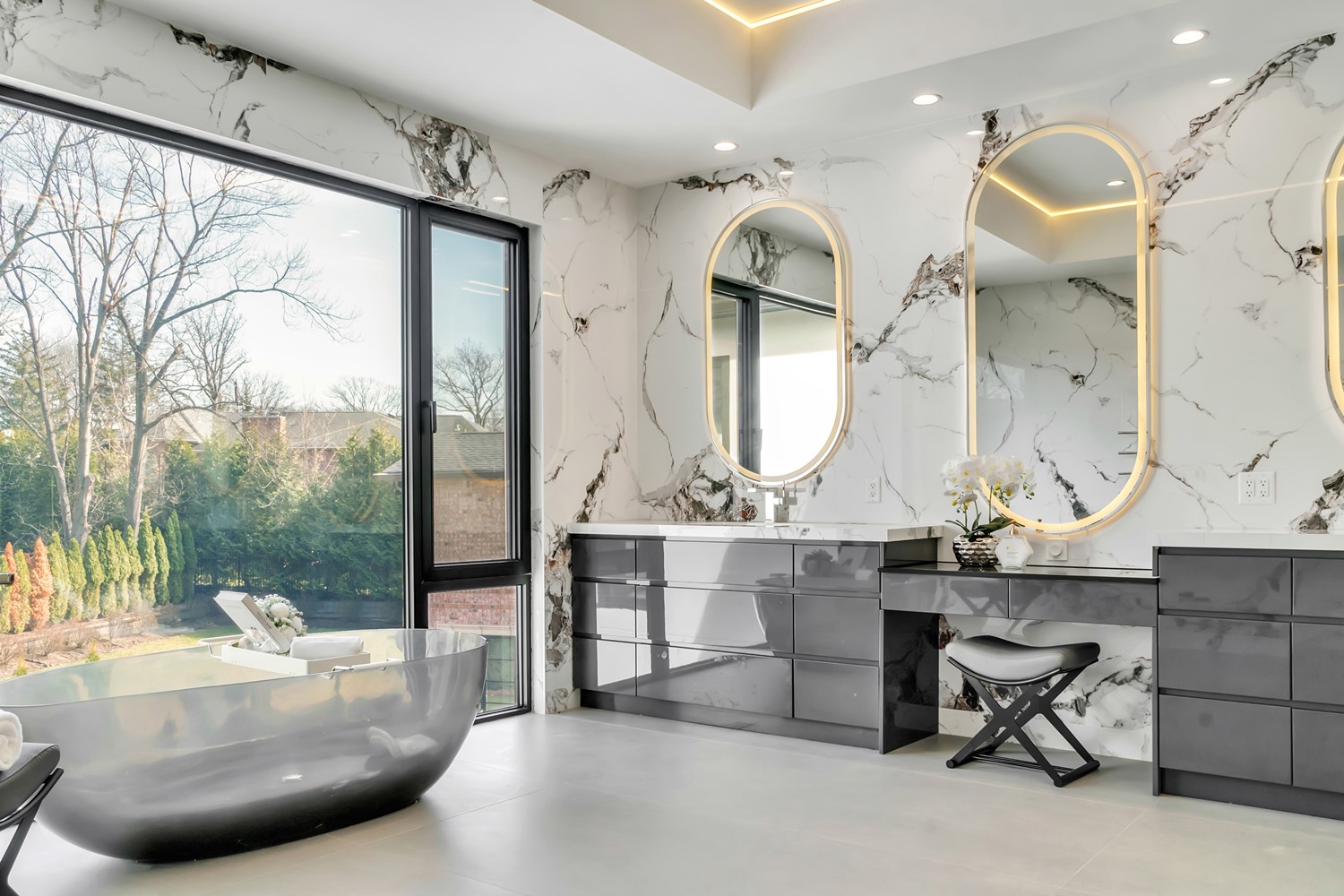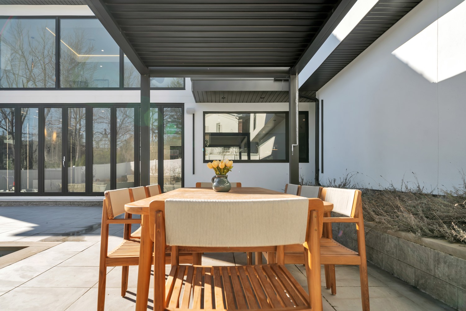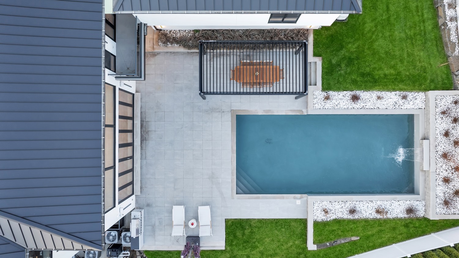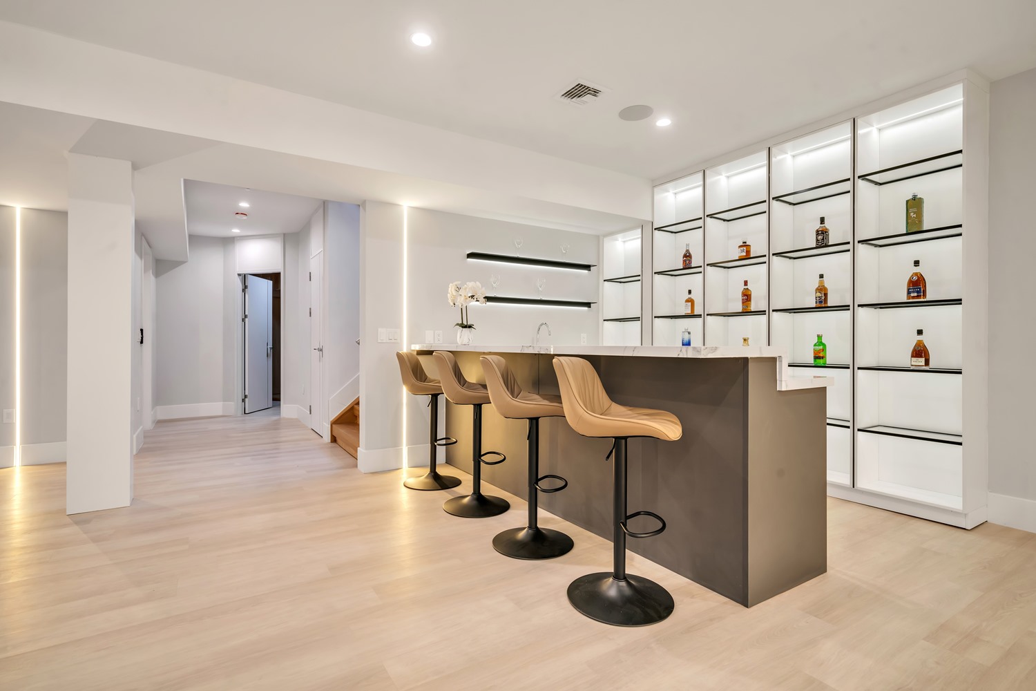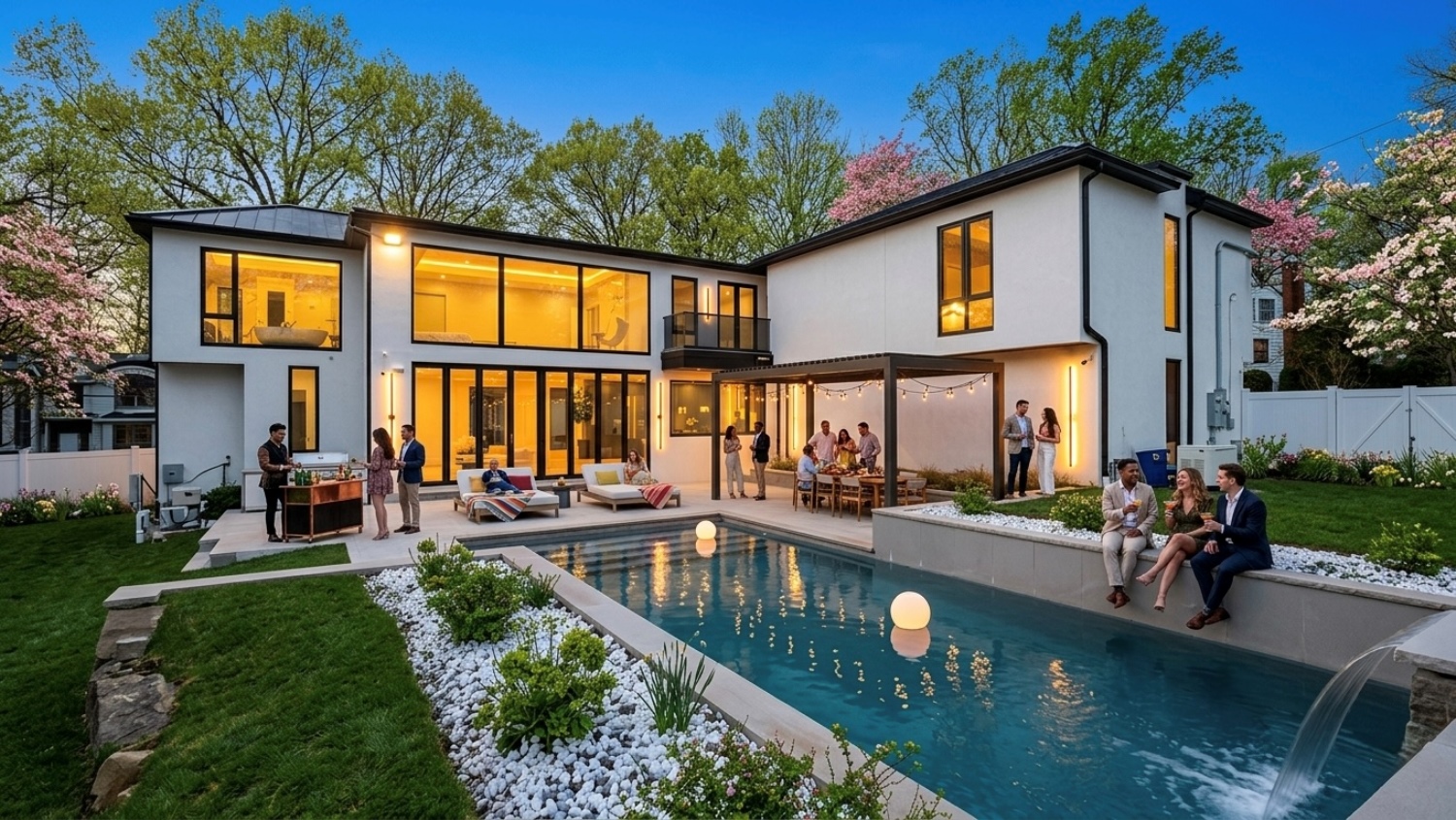 Located on Roberts Road, one of Englewood Cliffs’ premier streets, this new construction, metal roof 7-bedroom, 8.1 bath residence sits on 0.47 acres and offers approximately 11,500 square feet across 3 elevator-serviced levels. The main level features an open living space w/ fireplace and a full-width folding glass wall system that fully opens to the patio and pool. The kitchen is finished with custom high-gloss cabinetry, full slab stone with bookmatched detailing, a Sub-Zero and Wolf appliance suite, walk-in pantry, mudroom, office, 1st-floor bedroom suite, powder room, laundry w/ sink and built-ins, and a full bath serving the pool. Upstairs, the primary suite offers a sitting area, fireplace, beverage bar, balcony access, custom closets, bath w/ soaking tub, glass-enclosed shower, and towel warmer. A junior suite includes its own sitting area, beverage bar, and dual double-door openings for ventilation. Three additional bedrooms are all en-suite with custom closets. The fully finished lower level includes a theater with fully reclining massage seating, bar, recreation space, ~550 bottle wine room, additional bedroom, and full bath. Outdoor features include a heated gunite pool with waterfall, custom Walpole grilling station, pergola with adjustable roof, and anti-slip stone patio. A 3 car heated garage with EV provision, whole-house generator, metal roof, smart home system + irrigation, Sonos, and multi-zone heating & cooling with radiant heat complete the home.