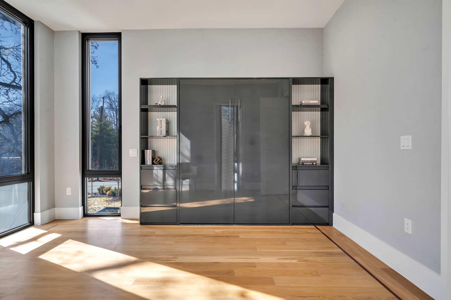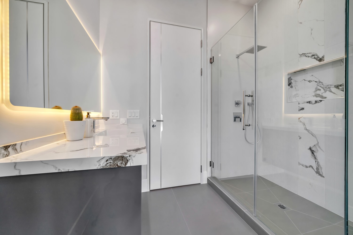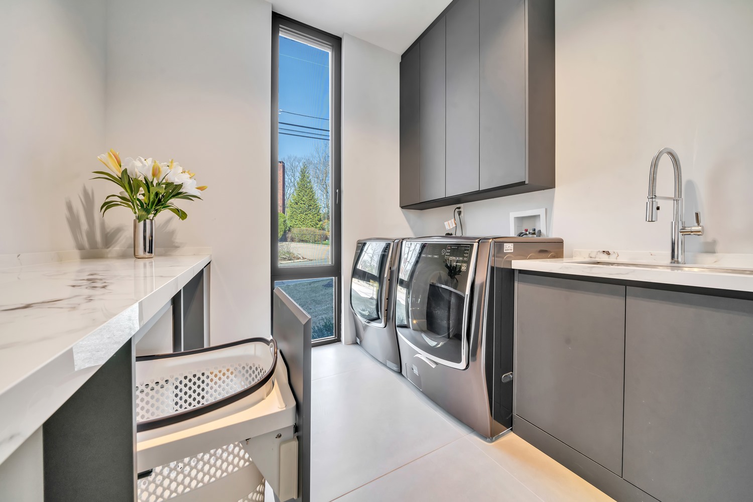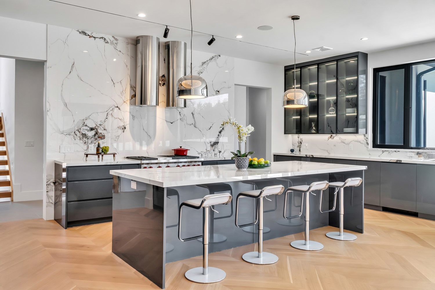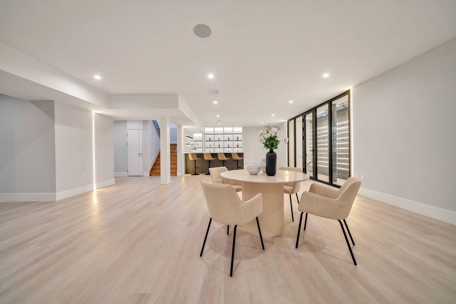 Located on Roberts Road, one of Englewood Cliffs’ premier streets, this new construction, metal roof 7-bedroom, 8.1 bath residence sits on 0.47 acres and offers approximately 11,500 square feet across 3 elevator-serviced levels. The main level features an open living space w/ fireplace and a full-width folding glass wall system that fully opens to the patio and pool. The kitchen is finished with custom high-gloss cabinetry, full slab stone with bookmatched detailing, a Sub-Zero and Wolf appliance suite, walk-in pantry, mudroom, office, 1st-floor bedroom suite, powder room, laundry w/ sink and built-ins, and a full bath serving the pool. Upstairs, the primary suite offers a sitting area, fireplace, beverage bar, balcony access, custom closets, bath w/ soaking tub, glass-enclosed shower, and towel warmer. A junior suite includes its own sitting area, beverage bar, and dual double-door openings for ventilation. Three additional bedrooms are all en-suite with custom closets. The fully finished lower level includes a theater with fully reclining massage seating, bar, recreation space, ~550 bottle wine room, additional bedroom, and full bath. Outdoor features include a heated gunite pool with waterfall, custom Walpole grilling station, pergola with adjustable roof, and anti-slip stone patio. A 3 car heated garage with EV provision, whole-house generator, metal roof, smart home system + irrigation, Sonos, and multi-zone heating & cooling with radiant heat complete the home.